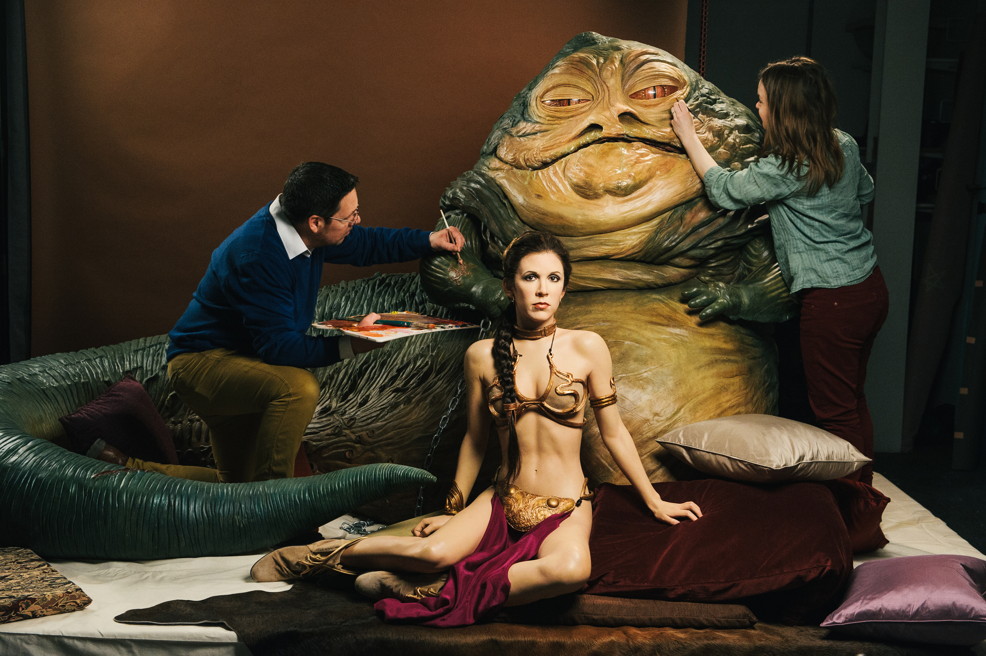 “These two figures are actually two of the most challenging of the cast of 16 characters we are creating,” commented Principal Sculptor on the project, Stephen Mansfield. He continued: “With Jabba we have sheer scale – he is 2.9m long, 1.5m high and weighs a whopping 35 stone. We used fibreglass moulding techniques to create the body mass, which has then been hand coloured in precise detail over a six week period. His massive eyes are made from glass and are each the size of a melon. Leia, of course, is portrayed in one of the character’s most iconic looks, in her gold bikini. We are acutely aware of the responsibility we have to get this right for fans, and we have been very lucky to work with the jeweller that made the original hair pieces worn by Princess Leia to recreate this level of detail.”
