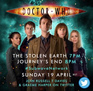 Russell T Davies, Graeme Harper, David Tennant and Catherine Tate are among those who will be livetweeting the global rewatch of The Stolen Earth / Journey’s End on Sunday April 19th starting at 7 pm BST (2 pm ET, 11 am PT)