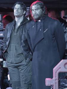Then there’s what this tells us. Cavill’s rocking a hoodie and a waist length leather jacket and it’s not the big fur collared affairs we’ve seen him in in the other stills. That says present day to me. Also given the logo on the sleeve, which looks a lot like the Legendary logo, it’s possible that’s just a real-world garment he’s wearing because it’s cold. But what Bautista is wearing is what really blew me away and confused me.