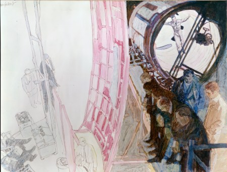 Kubrick gave Sanders a free hand on the set of 2001: A Space Odyssey, not giving any indication of what he wanted the illustrator to capture. “It was an absolute gift of a job, one of the things that very rarely happen to any illustrator – the only brief was to look and do what I wanted with it. That was wonderful. Not many people give you that. If I wanted to draw the lighting man sitting up in the roof I could do that.”