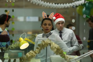 An office assistant wakes up in bed after the office party, but just what exactly happened, and what’s that message on her stomach.